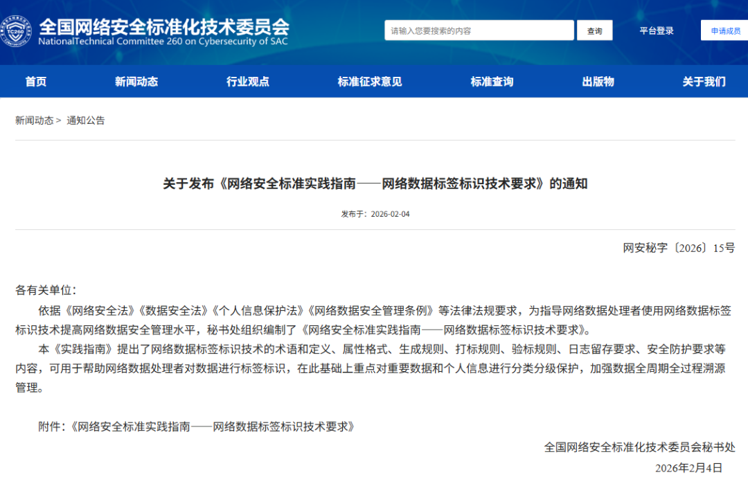 依据《网络安全法》《数据安全法》《个人信息保护法》《网络数据安全管理条例》等法律法规要求,为指导网络数据处理者使用网络数据标签标识技术提高网络数据安全管理水平,秘书处组织编制了《网络安全标准实践指南——网络数据标签标识技术要求》。该《实践指南》提出了网络数据标签标识技术的术语和定义、属性格式、生成规则、打标规则、验标规则、日志留存要求、安全防护要求等内容,可用于帮助网络数据处理者对数据进行标签标识,在此基础上重点对重要数据和个人信息进行分类分级保护,加强数据全周期全过程溯源管理。