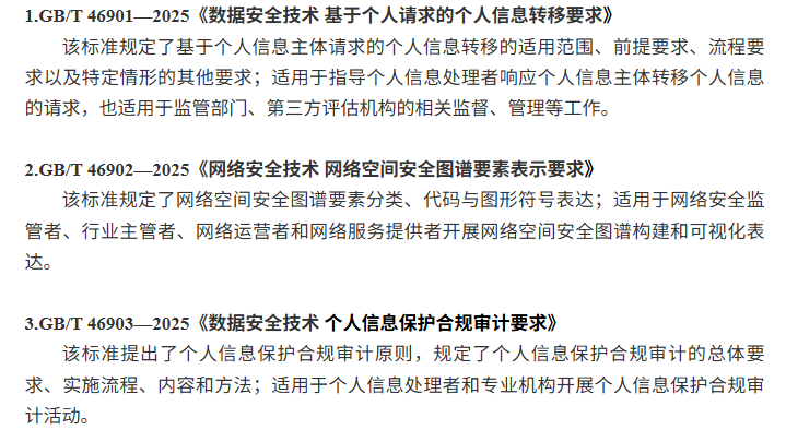近日,国家市场监督管理总局、国家标准化管理委员会发布的2025年第38号《中华人民共和国国家标准公告》,由全国网络安全标准化技术委员会归口的GB/T 46901—2025《数据安全技术 基于个人请求的个人信息转移要求》、GB/T 46902—2025《网络安全技术 网络空间安全图谱要素表示要求》、GB/T 46903—2025《数据安全技术 个人信息保护合规审计要求》3项国家标准正式发布,将于2026年7月1日起正式实施。