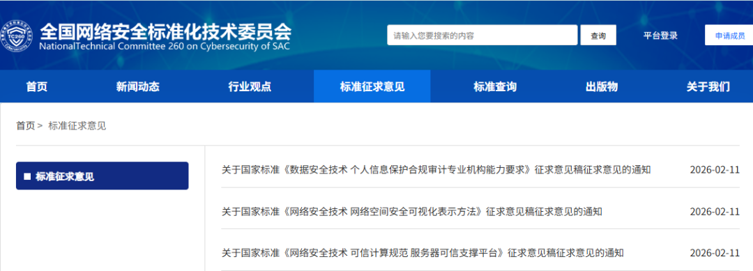近日,全国网络安全标准化技术委员会归口的《网络安全技术 网络空间安全可视化表示方法》、《数据安全技术 个人信息保护合规审计专业机构能力要求》、《网络安全技术 可信计算规范 服务器可信支撑平台》3项国家标准现已形成标准征求意见稿。根据《全国网络安全标准化技术委员会标准制修订工作程序》要求,现将该3项标准征求意见稿面向社会公开征求意见。