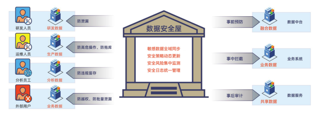 作为中信网安自主研发的数据安全核心产品,“华安星数据安全屋系统”面向数据运维、数据共享、数据开发等关键数据使用场景,基于超融合技术架构,融合数据库堡垒机、数据脱敏、数据加密、数据水印和数据库防火墙等能力组件,提供可伸缩的一键部署能力。同时系统结合机器学习和基线算法,对内部数据泄露行为进行周期性感知与分析,实时监测数据流转、访问及风险行为,简化数据安全措施实施复杂度,构建统一、安全、智能、高效的数据资产安全防护机制,有效提升数据使用合规性和防护水平。
